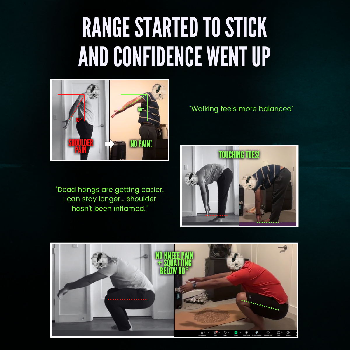 I’ll be monitoring your form, posture, pain, strength, and range of motion levels every week so we can make the necessary adjustments and tweaks in real time. This way you’re always on track to hit your goals no matter what challenges you face on your journey.