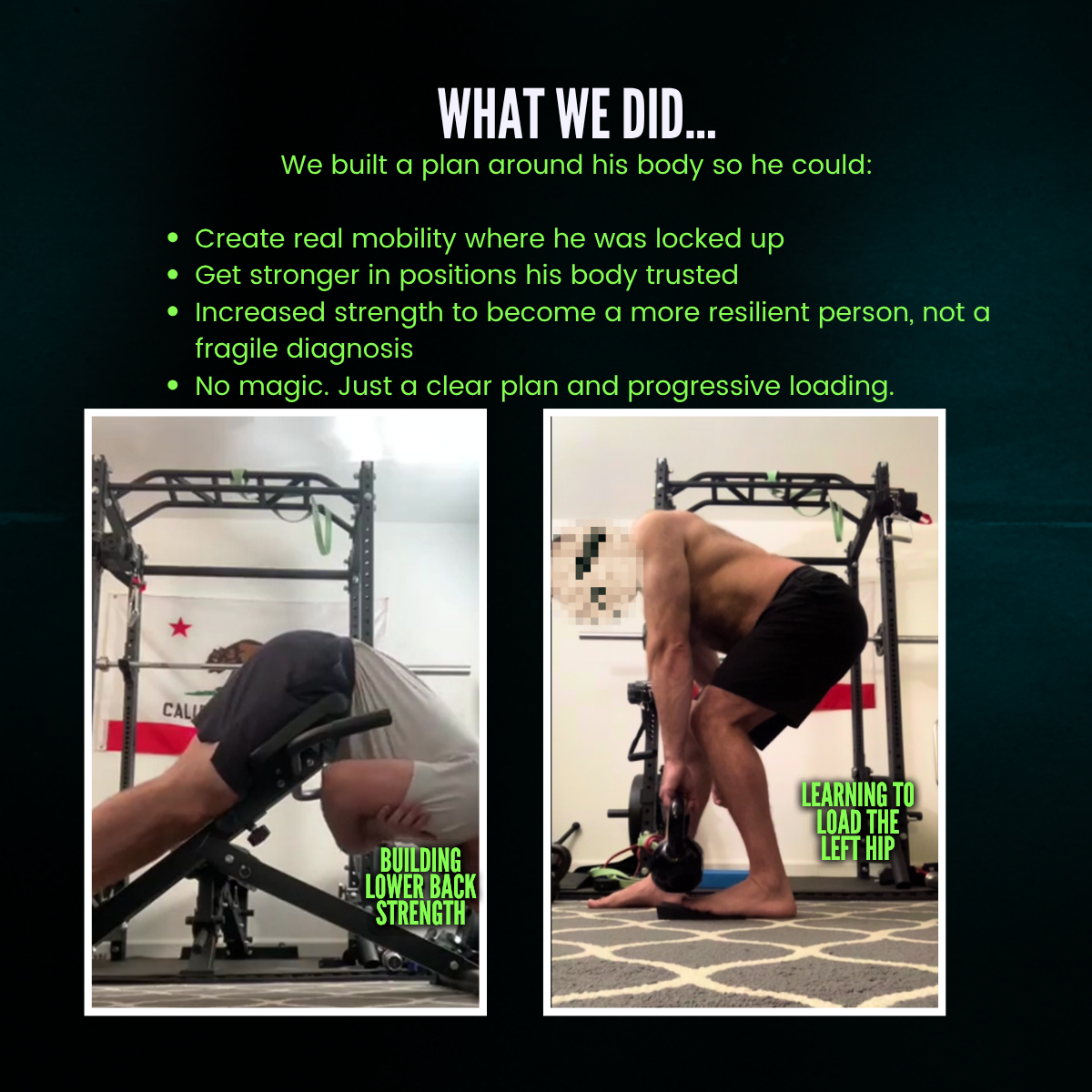 That’s how you’ll end up sticking with this long-term and actually ENJOY the process. This approach is absolutely critical for long-term weight loss, strength building, and elimination of physical pain and discomfort so you can get back to your favorite sports and life activities without any physical inhibitions.